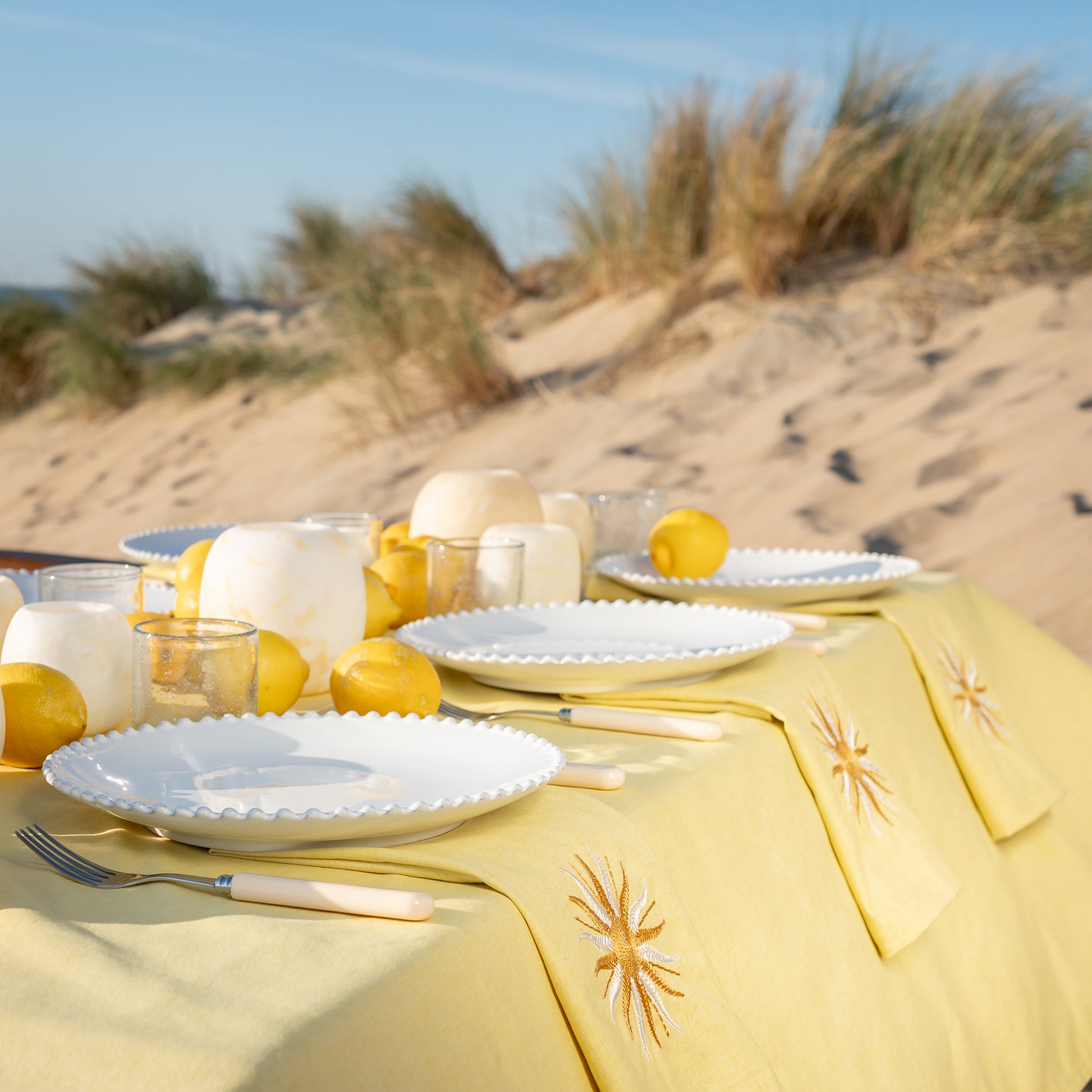 Dit tafelkleed heeft dé perfecte gele kleur. Botergeel! En daar is geen woord aan gelogen! Zonnig en zomers; je wordt er direct blij van. De mooie zware stof dekt je tafel met een luxe, rijk gevoel. Stijl het geheel af met zomerse windlichten, onze Blooming placemats, véél citroenen, en natuurlijk onze matching Limon Cello servetten.